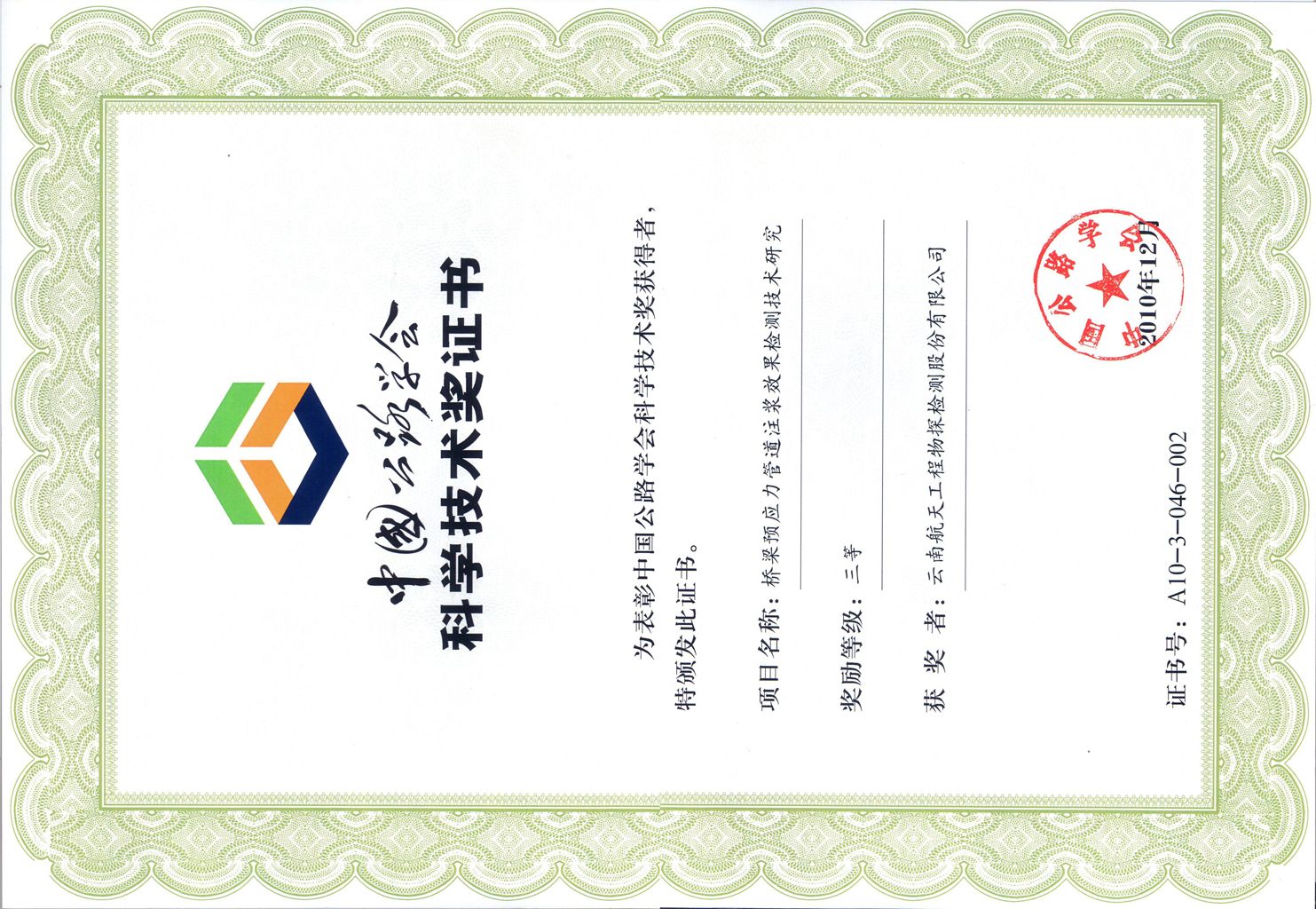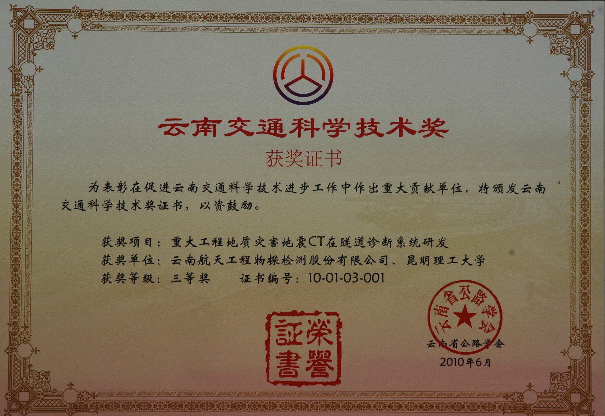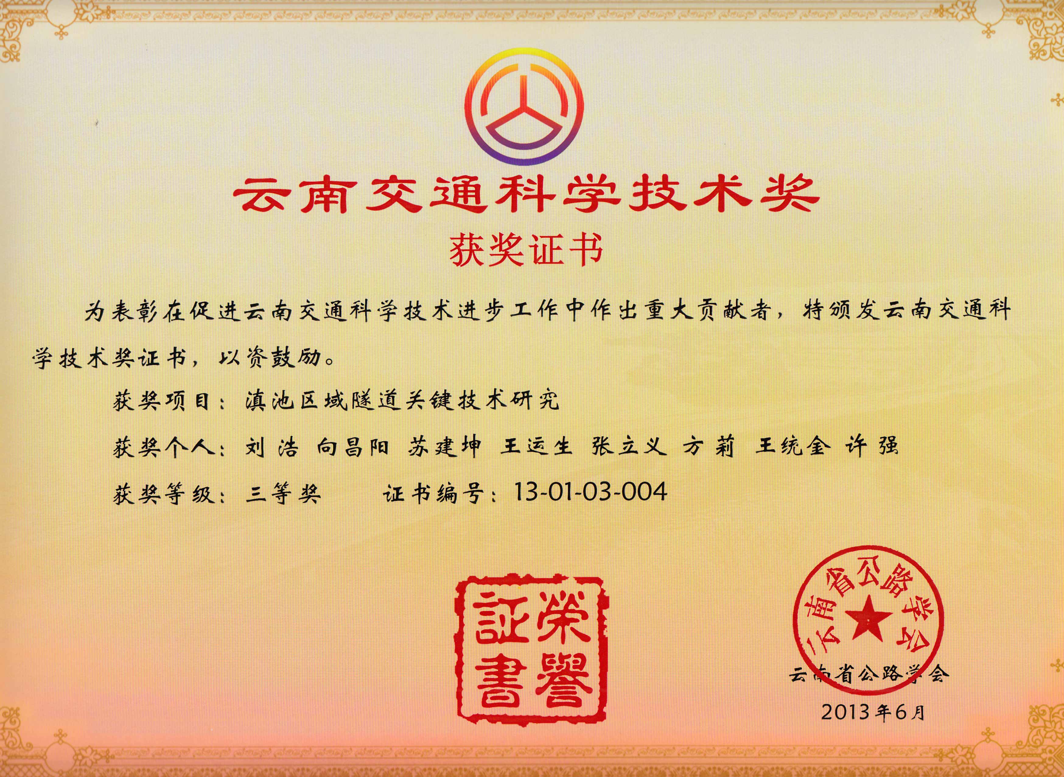 云南省交通科技進(jìn)步三等獎(jiǎng)