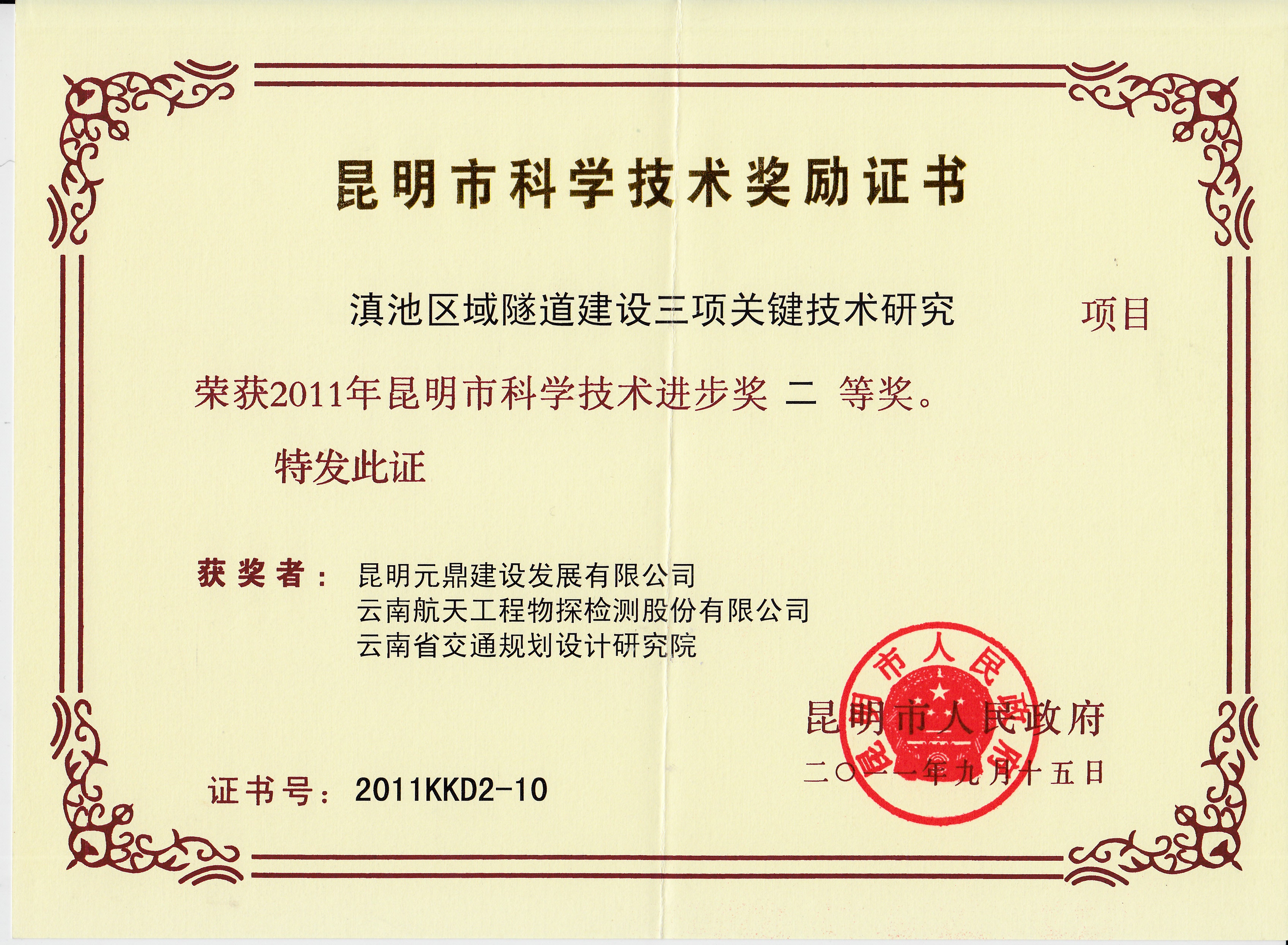 昆明市科技進(jìn)步二等獎(jiǎng)