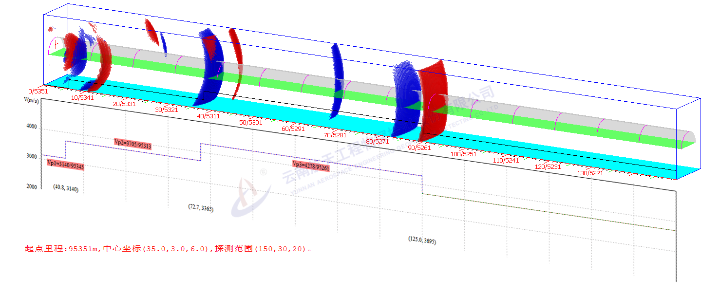 說明:圖中上半部分為三維成像結果,紅色藍色為巖體軟硬變化引起的反射界面,該圖反應掌子面前方地質的變化情況及災害體的分布、性質;下半部分為波速掃描分析結果,反應前方巖體波速分布情況,為判定圍巖級別提供重要依據。