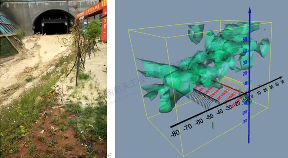 說明:右圖中深藍色、藍色為富水區,綠色為含水區,灰白色為干燥的圍巖