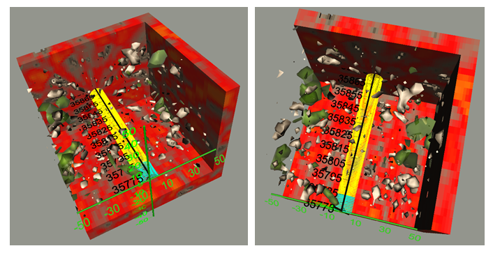 使用地下空間三維探測車,基于傘角回旋自動掃描疊加點測模式,雷達波束以環向掃描間距5°,空間掃描傘角分別為10°、20°、30°、40°、50°、60°、70°、80°、90°,根據現場了解的事故現狀,對探測點YK38+345里程沿隧道施工掘進前方呈半球狀對右幅測區空間全覆蓋,探測點ZK38+345.5里程向左斜交隧道施工掘進方向約30°呈半球狀對左幅測區空間交叉覆蓋。