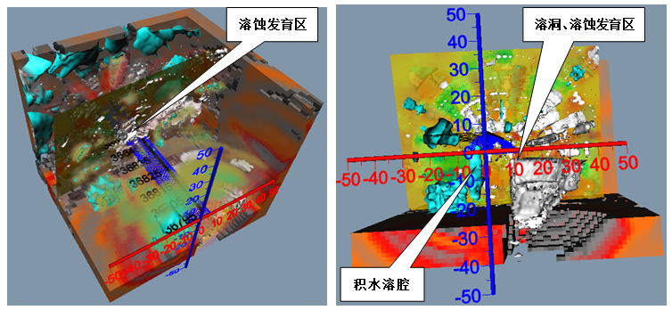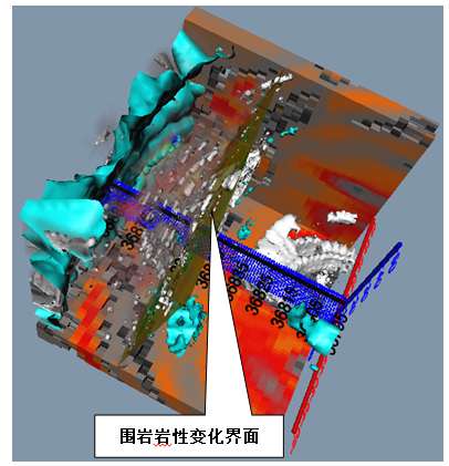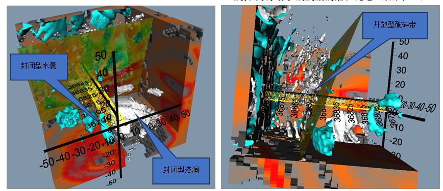 圖3 扎西勝利隧道進口左幅ZK36+795~K36+855段周邊圍巖富含水及溶蝕發育區分布探測結果