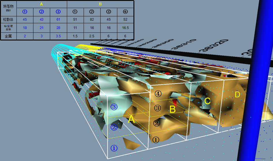 洞室單元 | 松散體m3 | 砼/堅硬巖塊m3 | 金屬m3 | 影響里程K38+m |